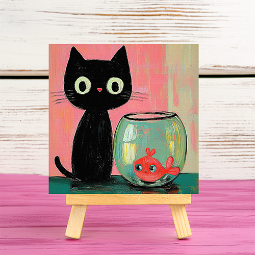 Elevate your décor with the “Cute Cat and Goldfish” mini printed canvas with wooden stand. This playful artwork captures a sweet and curious moment, making it an ideal piece for animal lovers, quirky décor, and charming gifting.