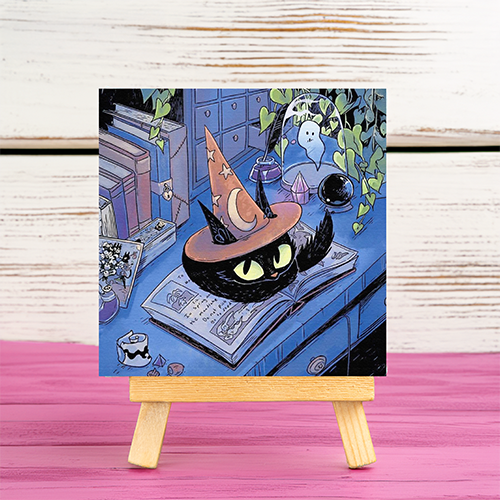 + Free ShippingElevate your décor with the “Cute Witch Cat” mini printed canvas with wooden stand. This enchanting artwork combines feline charm with a touch of magic, making it a delightful addition for cat lovers, whimsical décor, and thoughtful gifting.
